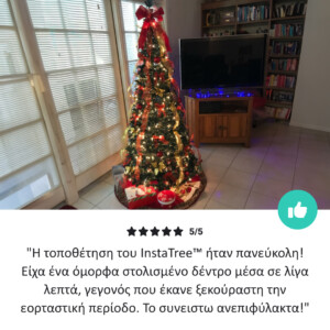 Είναι ιδανικό για μικρό διαμέρισμα. Είναι εύκολο στη συναρμολόγηση και στην αποθήκευση. Εάν έχετε ένα πολυάσχολο πρόγραμμα εργασίας όπως εγώ, είναι ιδανικό γιατί θα στήσετε γρήγορα ένα χριστουγεννιάτικο δέντρο με τα στολίδια που έχουν ήδη τοποθετηθεί. Επίσης, αποθηκεύεται γρήγορα και εύκολα. Το προτείνω ανεπιφύλακτα.