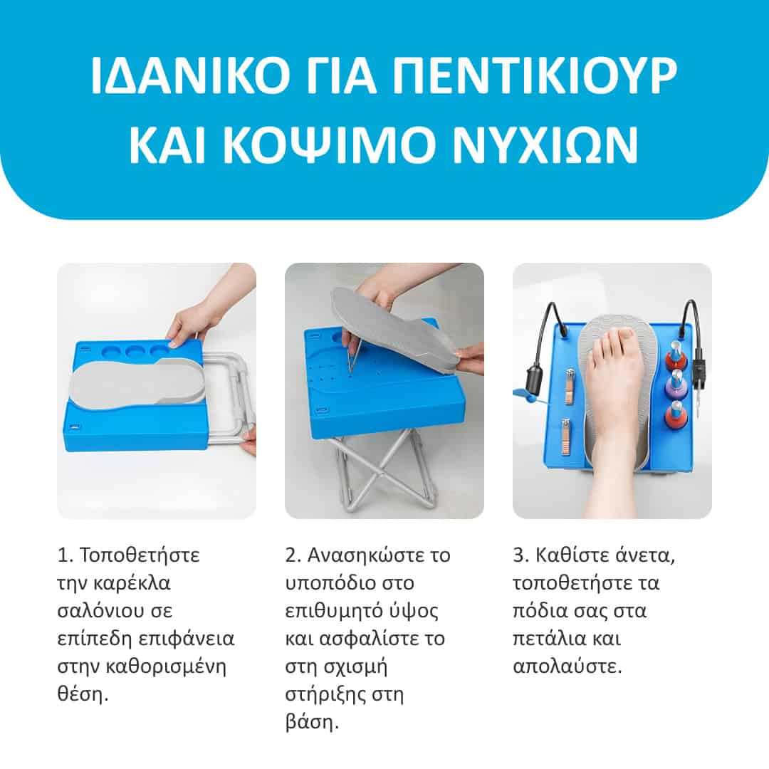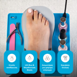- Τέλος στις κάμψεις ή τεντώματα – Το ρυθμιζόμενο υποπόδιο διατηρεί τα πόδια στην τέλεια θέση για να βάψετε τα νύχια με ευκολία.