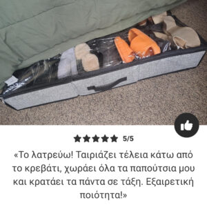 Λύση ιδανική για την οργάνωση των παπουτσιών! Επιτέλους όλα είναι σε τάξη και χωρίς ακαταστασία. Οι λαβές είναι ανθεκτικές και το φερμουάρ λειτουργεί τέλεια. Συνιστάται